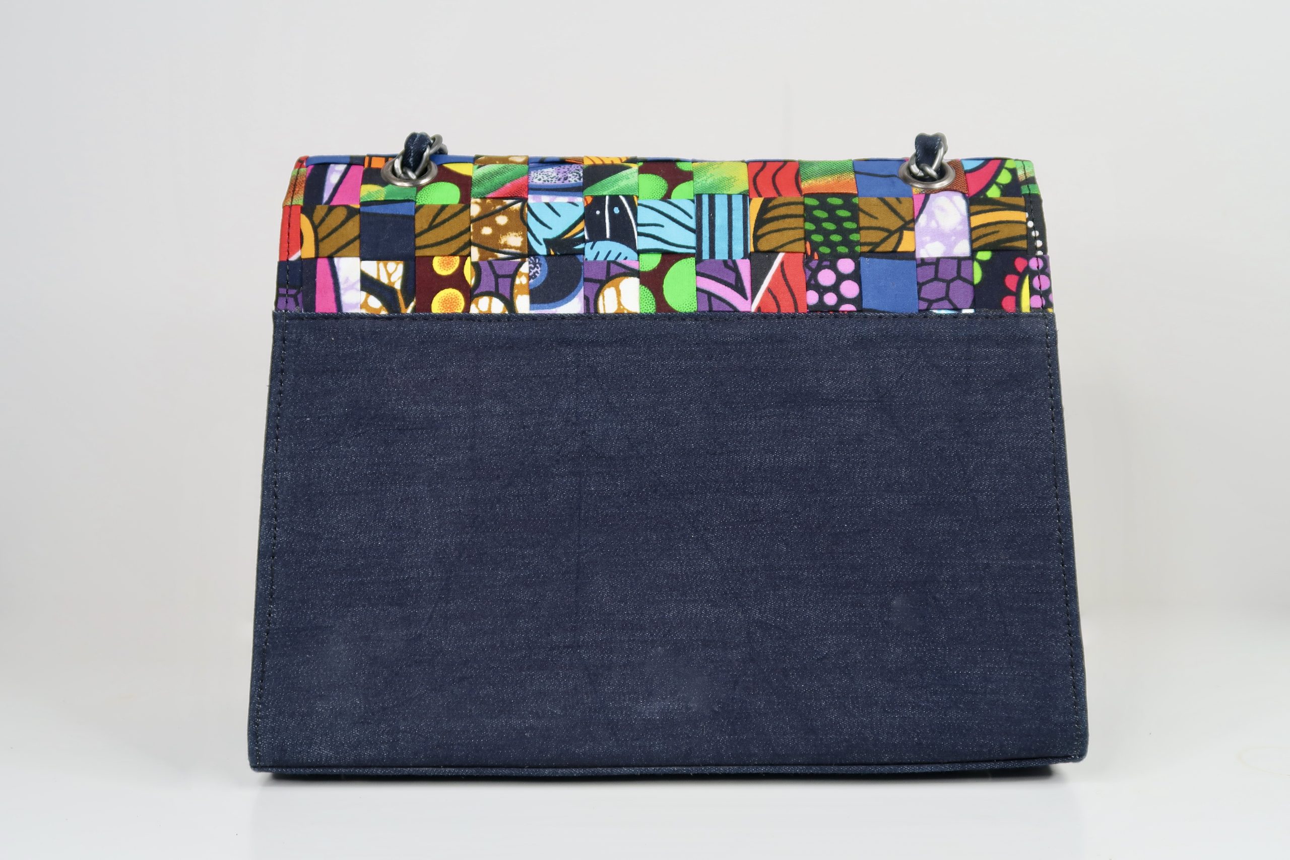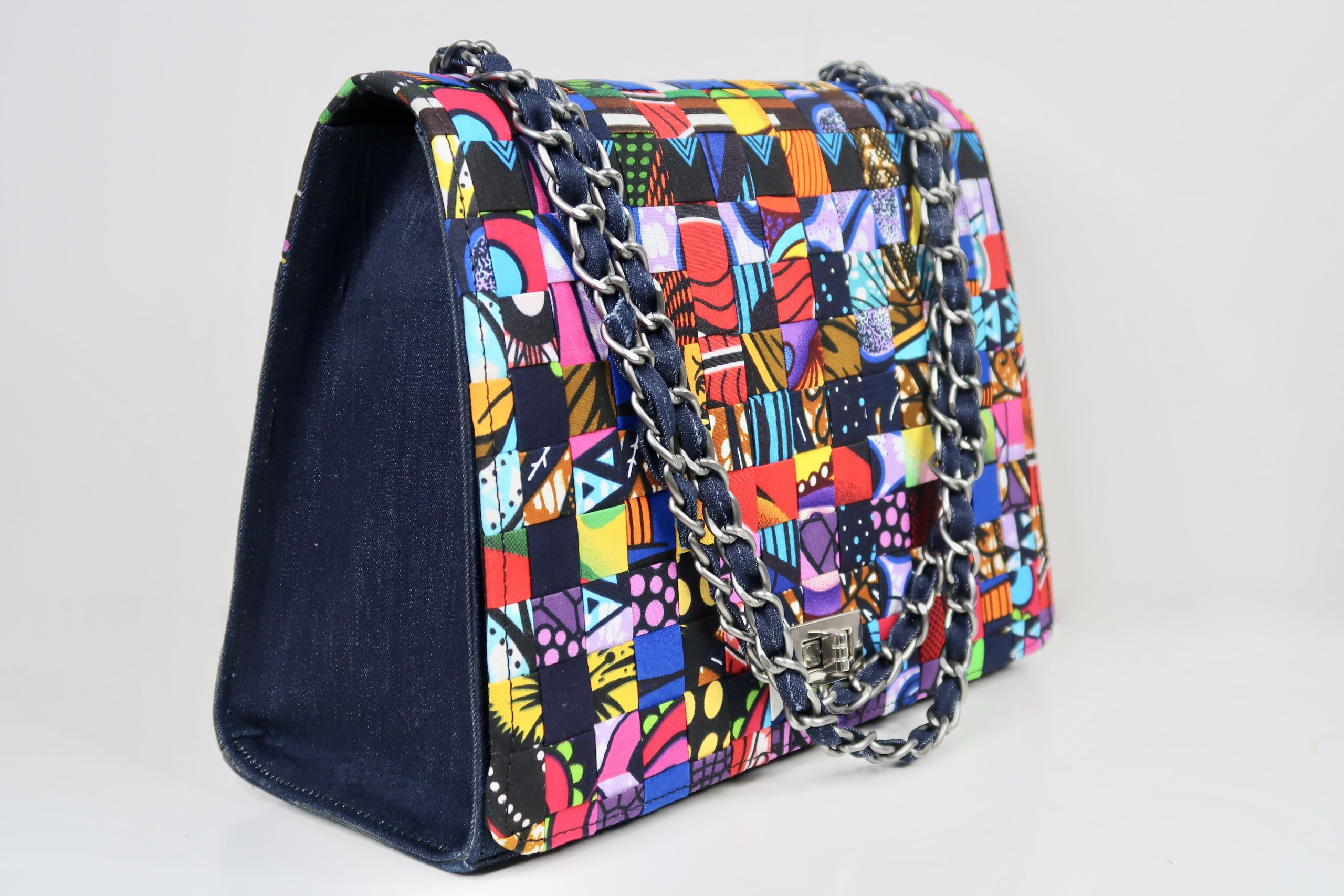 Make a statement with the Ankara Heritage Luxe Chain Bag – Indigo Mosaic, a unique blend of vibrant Ankara patchwork and modern denim detailing.